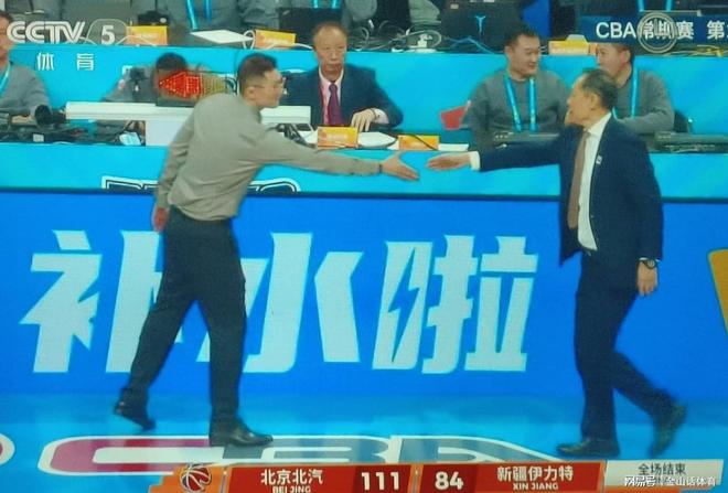 84-111,當(dāng)裁判吹響比賽結(jié)束的哨聲,新疆男籃主帥劉煒,臉色凝重的緩緩走向中場(chǎng),與迎面走來(lái)的北京隊(duì)主帥許利民握手,倆人之間沒(méi)有語(yǔ)言交流,劉煒下意識(shí)的扶了扶眼鏡……
